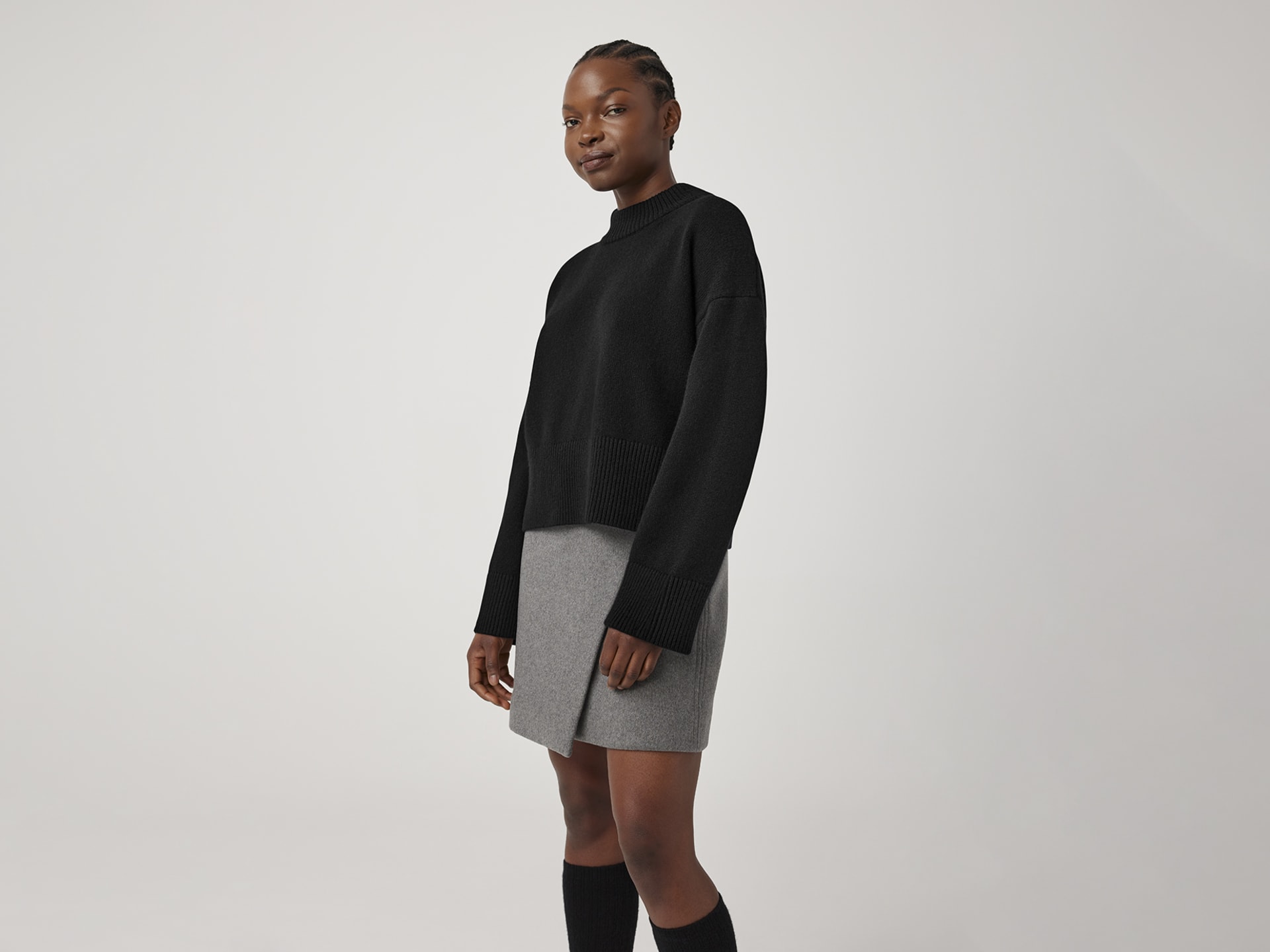 The Copal Cashmere Mockneck has dropped shoulders, elongated sleeves and a slightly cropped body. It’s knit with 100% Cashmere Yarn, selected for its next-to-skin softness and breathability.