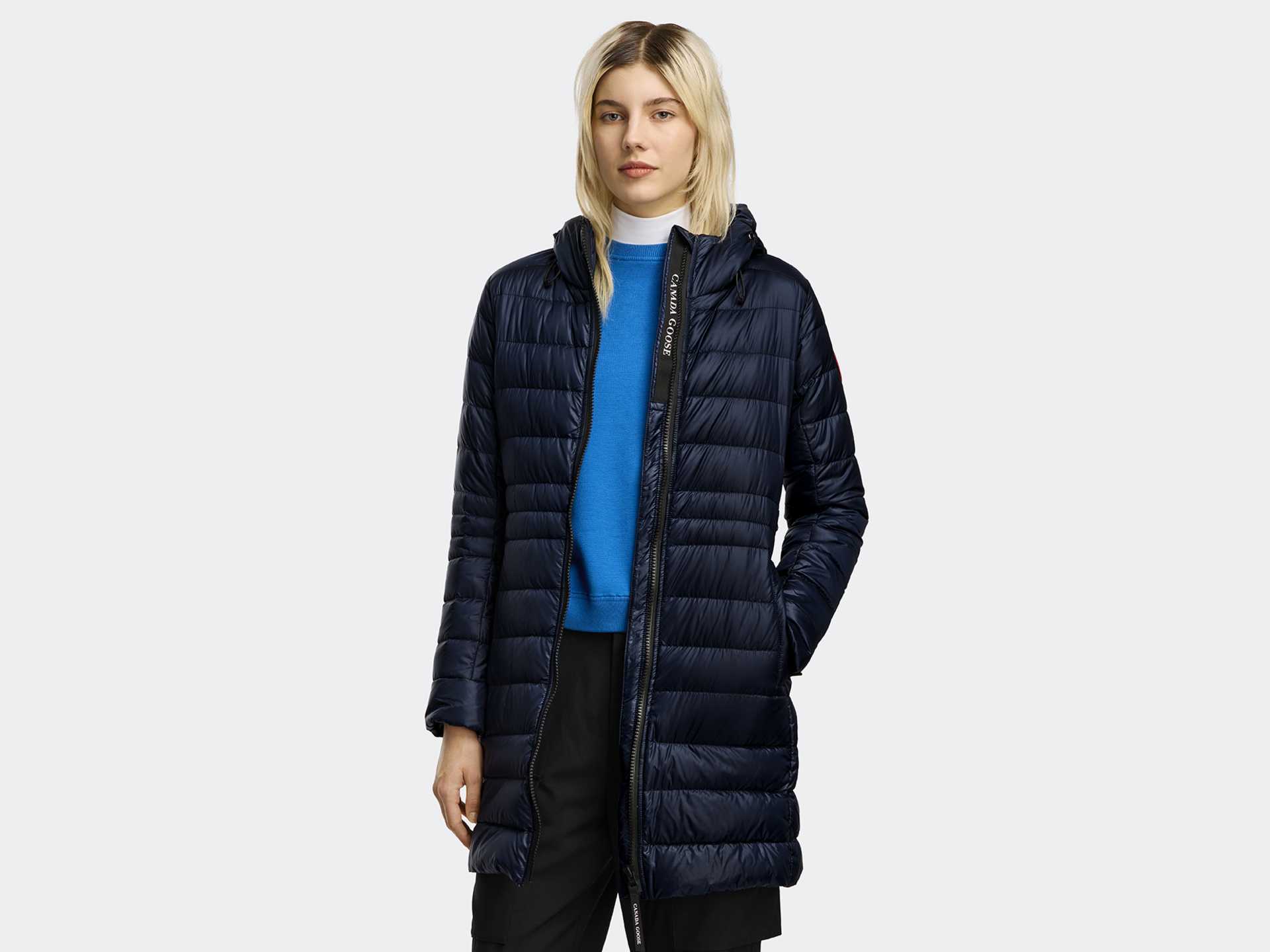 - Down-filled hood is adjustable and adds warmth and element protection. Signature double-stripe reflective details at the back add visibility in low light