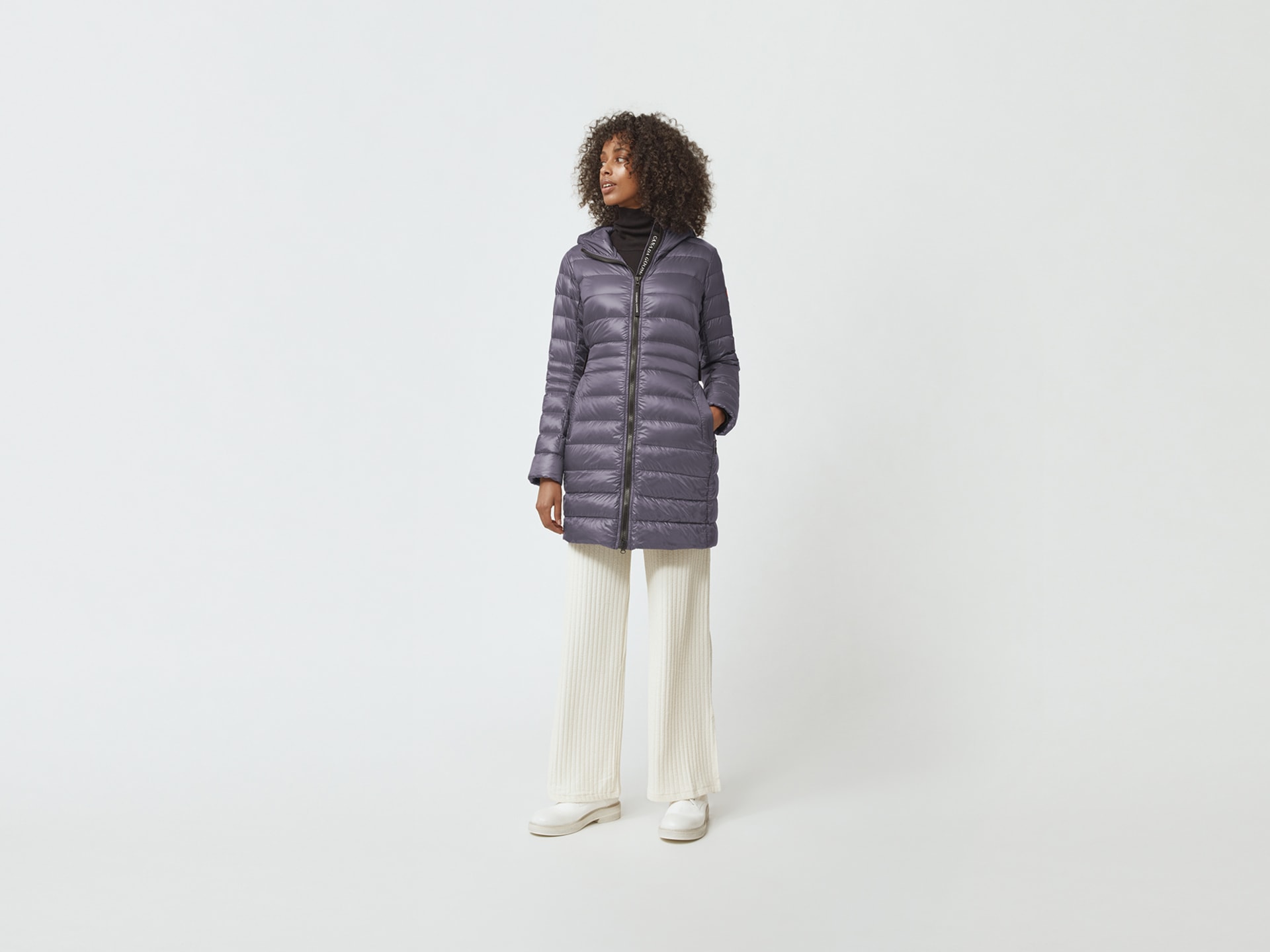 - Down-filled hood is adjustable and adds warmth and element protection. Signature double-stripe reflective details at the back add visibility in low light