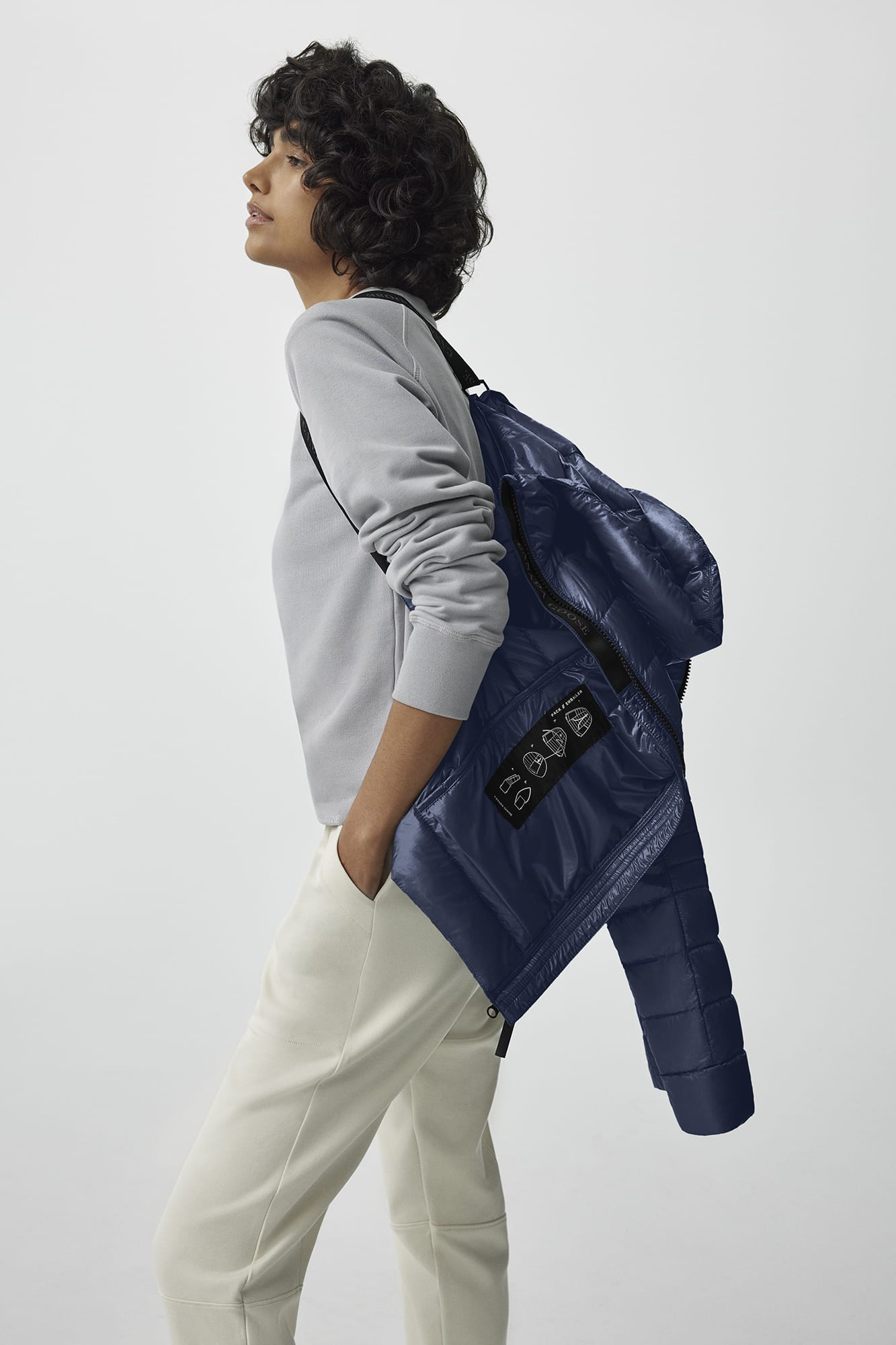 - Removable backpack straps that converts into a cross body strap when the jacket is packed
